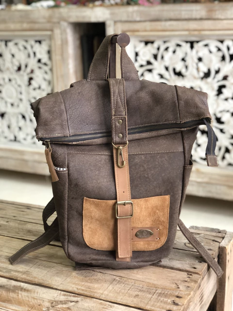 Realizada en Cuero Bull Brown combinada con gamuza suela. Detalles de terminaciones y refuezos para soportar peso.