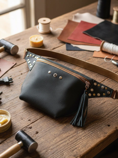 Realizada en cuero con bolsillo de cierre frontal